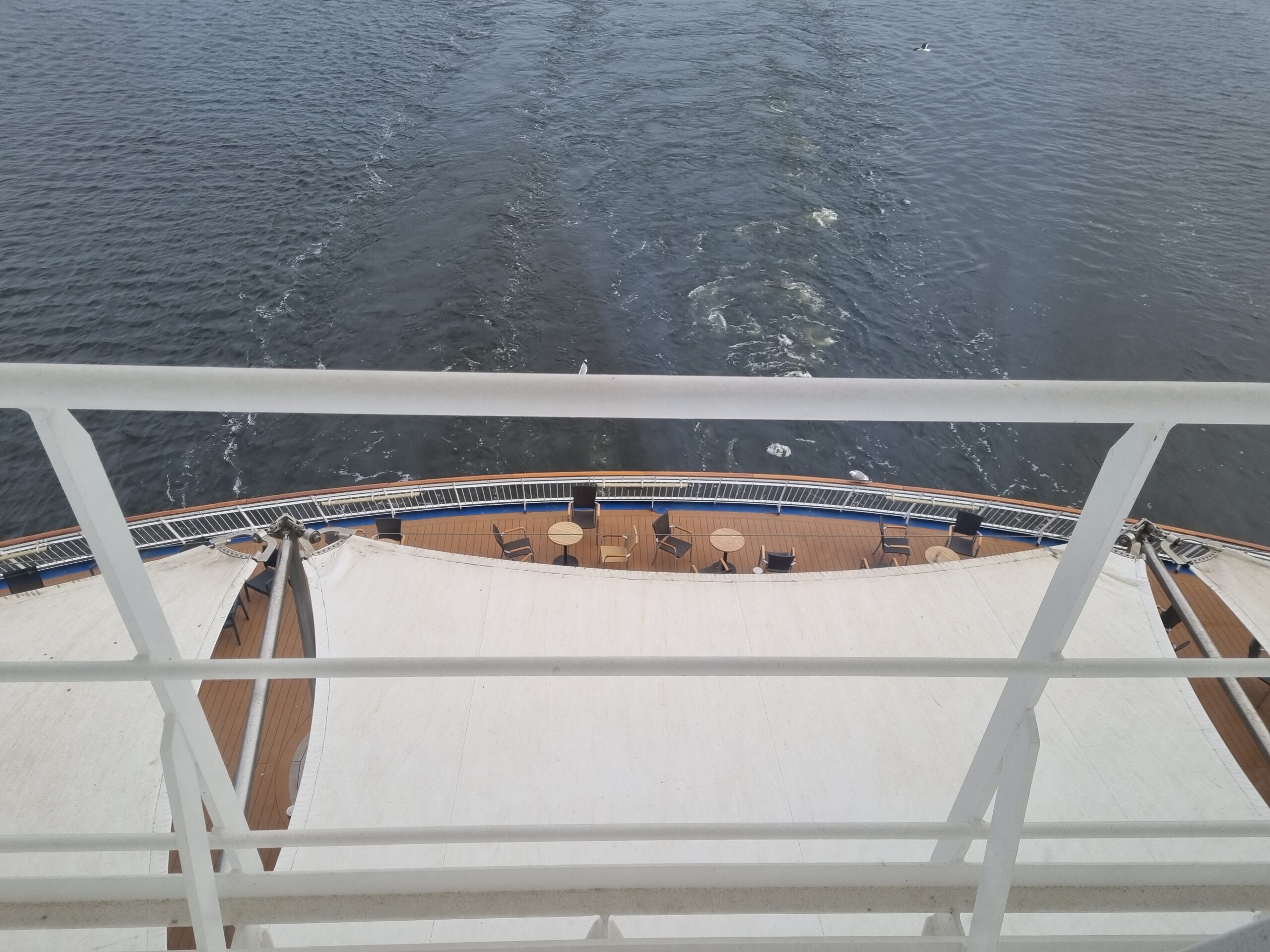 Utsikt från hytten ner mot soldäcket på fartyget.