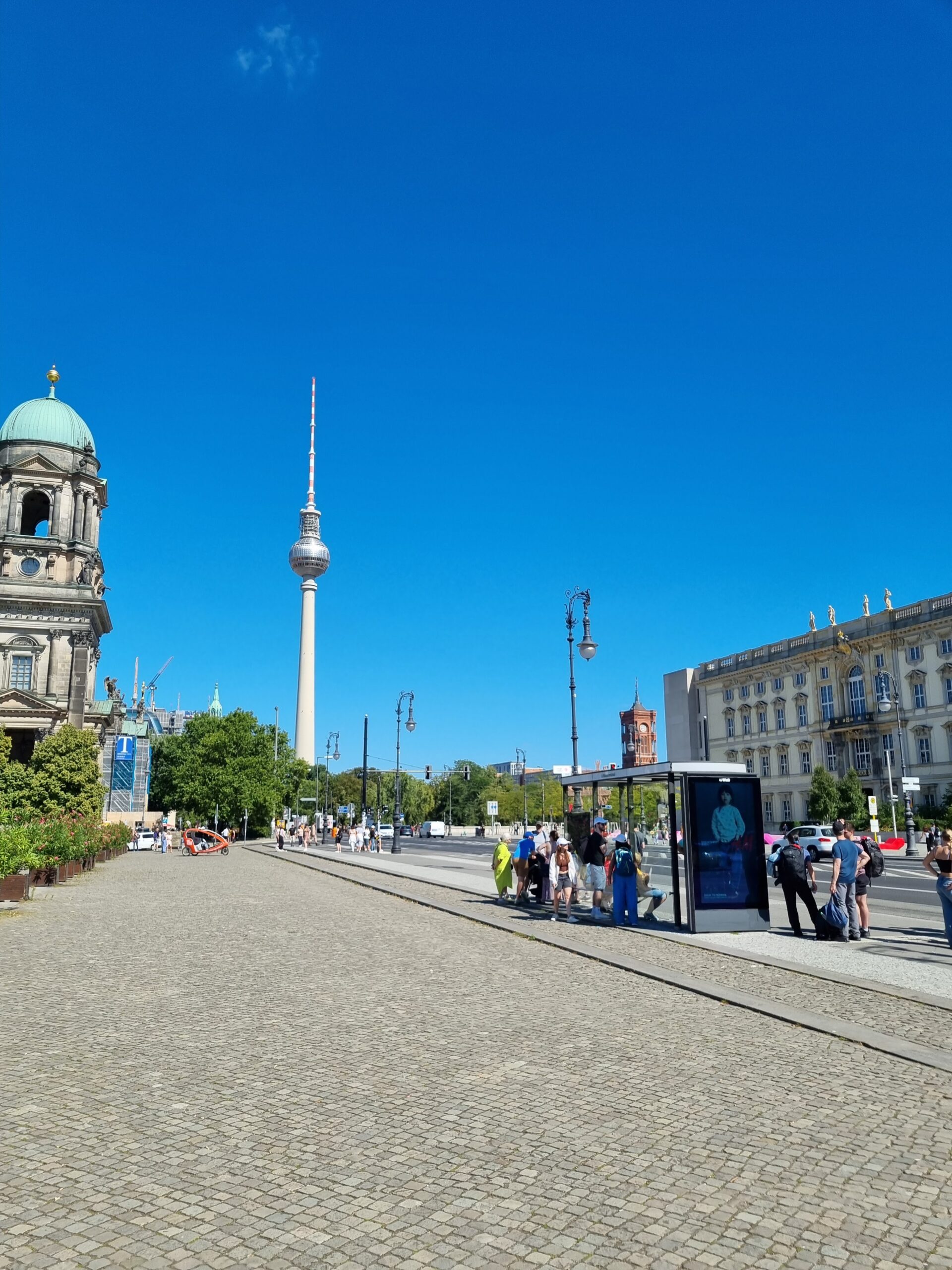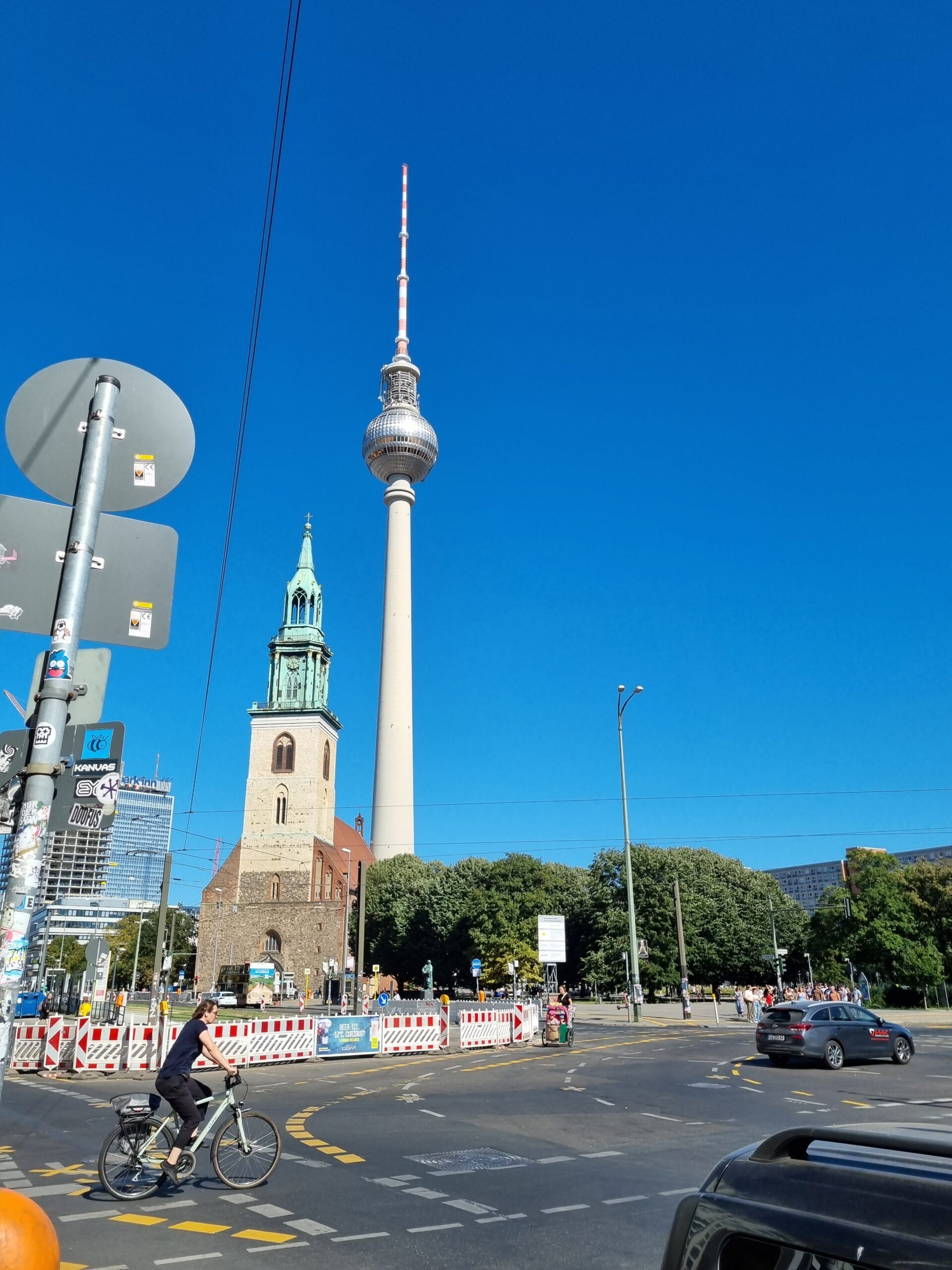 Åkte S-tåg från Brandenburg Airport in till Berlin Hauptbahnhof. Promenerade sedan till Alexanderplats där TV tornet man kan åka upp i finns. Åkte inte upp denna gång. Åt glass på en glassbar med sittplatser. Satt inomhus för att undvika getingar. Svalare inomhus också.