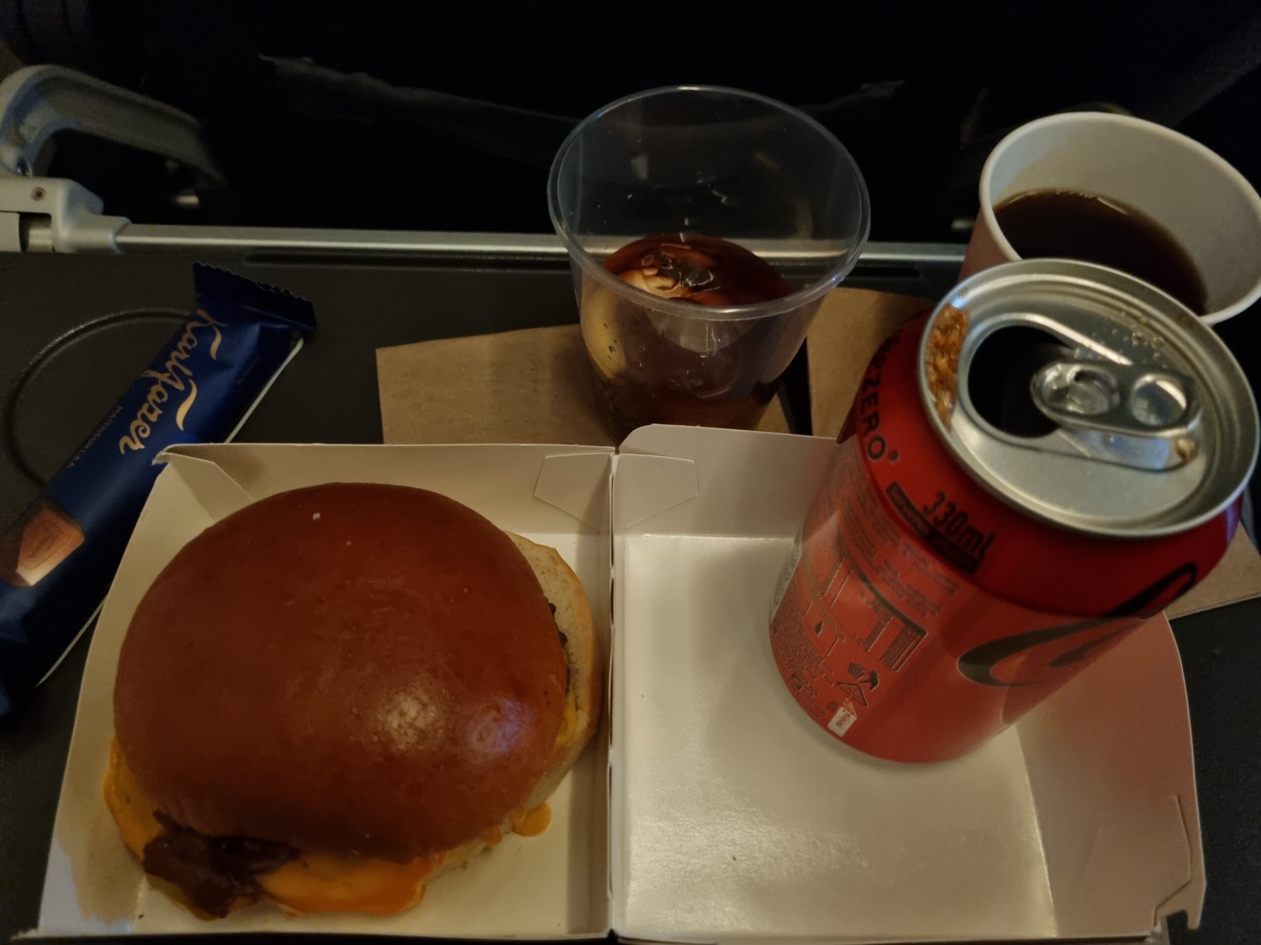 Hade förbeställt en smashed cheeseburger som serverades ombord på flygplanet efter start. Köpte cola och fick is och citron i. Köpte chokladbit och fick gratis kaffe ombord slm vanligt på detta flygbolag.