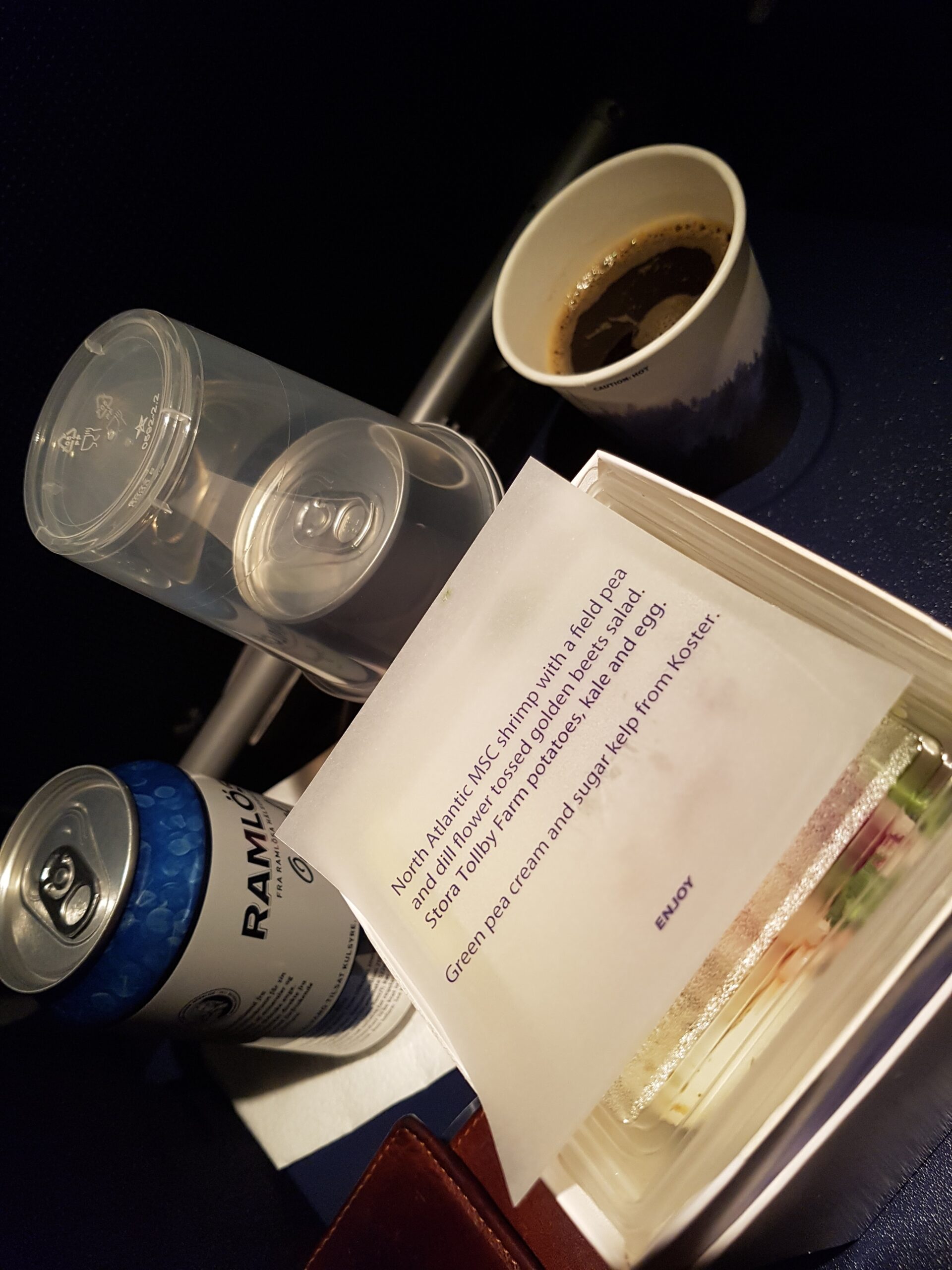 För 195 kr extra per flygsträcka (redan betalat 109 kronor per väg) fick jag uppgradera måltiden till en Premium variant. Jag har gjort detta förut men denna gång var den inte lika Premium. Hursomhelst så var maten på brickan ganska god och det var lite finare ostar och en liten förrätt med kallrökt lax och ostcreme. Dessutom ingick en dryck och en kaka till kaffet. Bröd erbjöds också och det var gott det med.