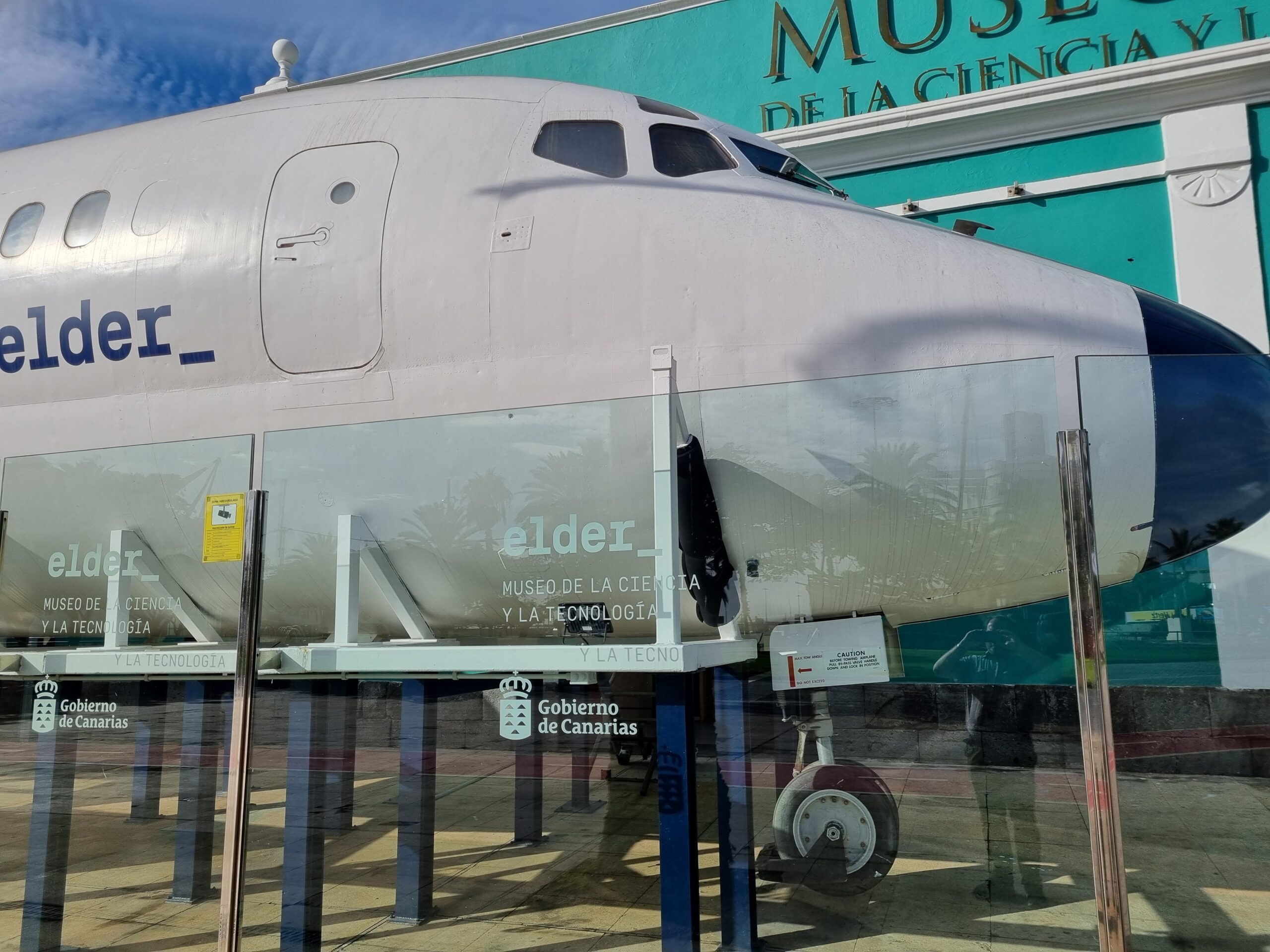 Nej, detta är inte en flygplats! Det är ett muséum i staden Las Palmas på ön Gran Canaria. Ett teknikmuséum helt enkelt. Utanför har de ställt upp en del av en DC-9 passagerarflygplan. Nospartiet med cockpit och första stolsraderna. Samt noshjulet.