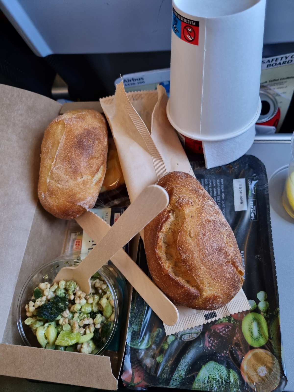 Detta är den ordinarie måltiden som serveras alla som betalat 110 kr per flygsträcka. I detta fall var det kallt bröd, smör, dessertost, kex, varm kyckling med ris och rosmarinsås, quinoa-sallad med dressing och tomat. Samt en hallonmousse till efterrätt. Gott!