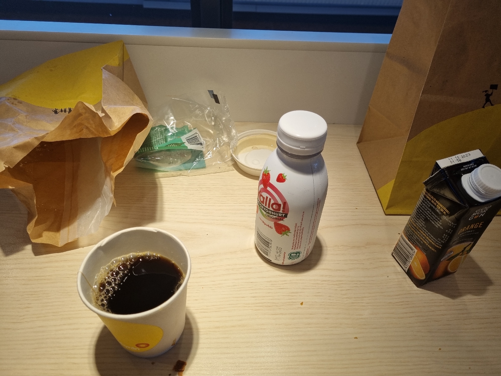Så en frukost på Arlanda efter säkerhetskontrollen. Ost/skinksmörgås, juice, drickyoughurt,kaffe och varm chokladcroissant. 110 kr.