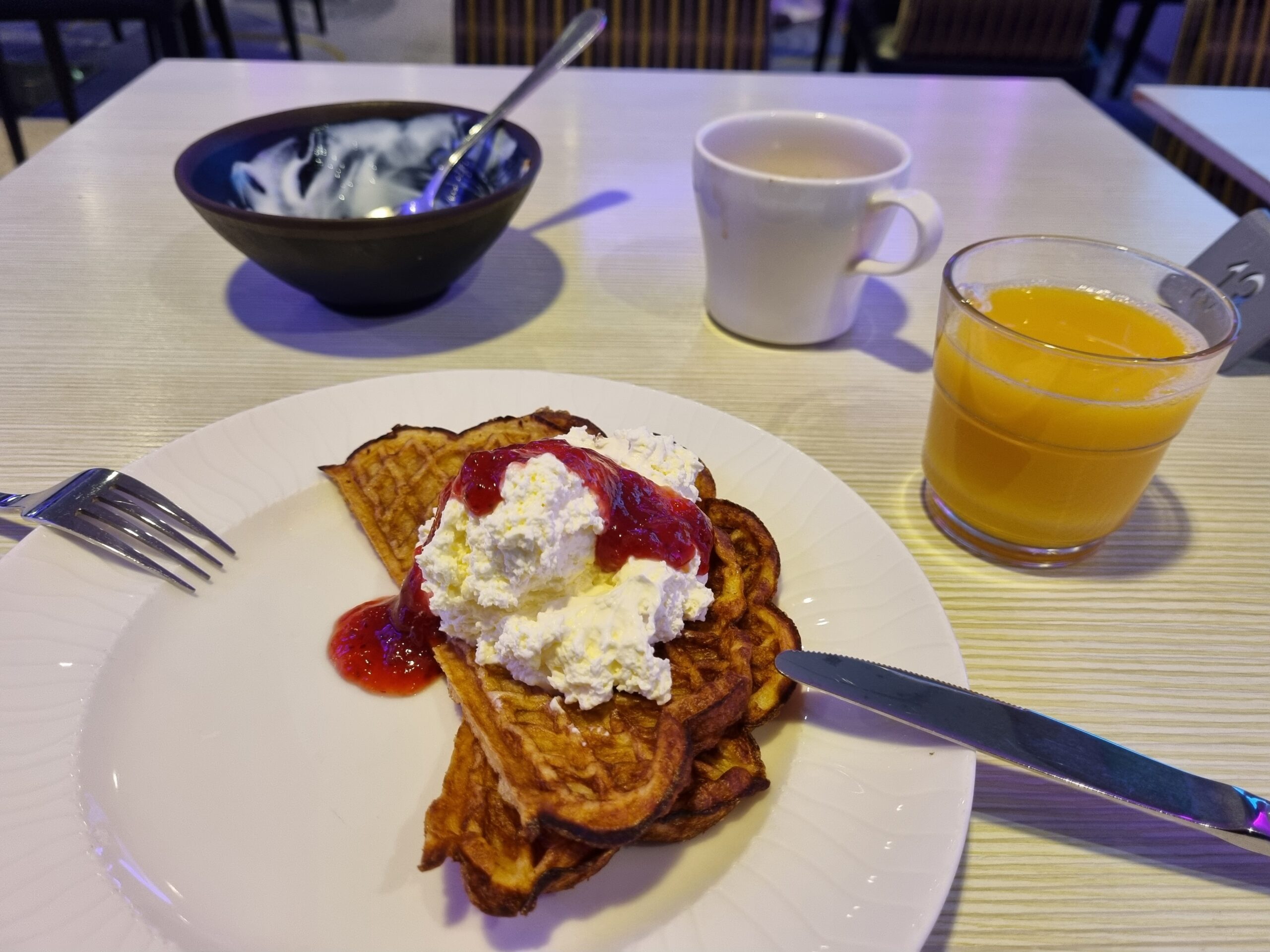 Frukost, youghurt med musli och torkad frukt, juice, kaffe och våfflor med sylt och grädde. Fanns även varmrätter som äggröra, köttbullar samt kall fisk som sill och rökt lax. Många sorters pålägg, kött, skinka, ostar, bröd, fruktsallad, croissanter, donuts. Välj första sittningen frukost! Jag valde andra sittningen och då var nästan inget kvar åt mig på buffeten.