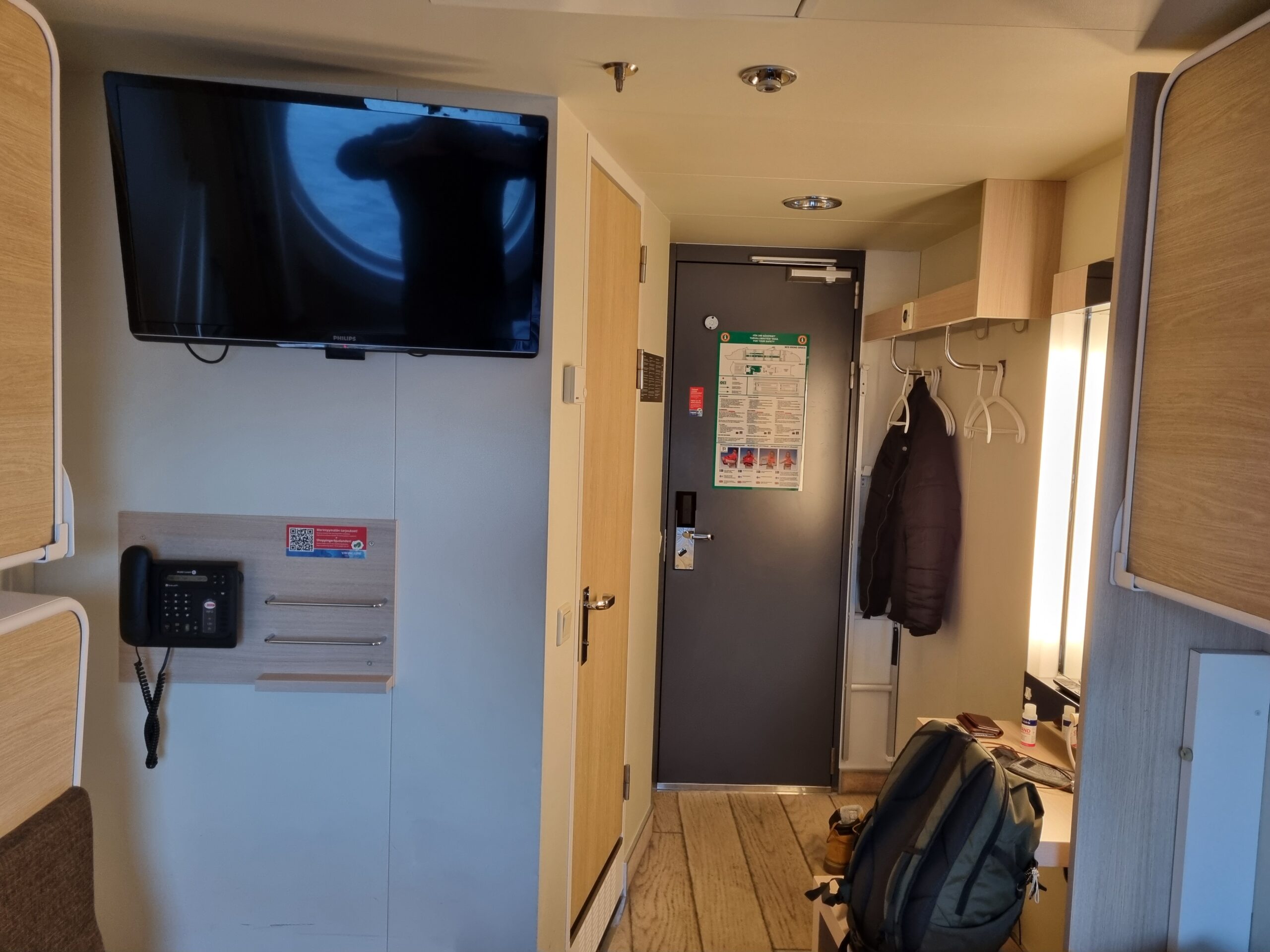 Rymlig standard fönsterhytt. TV, interntelefon, hårtork, litet smink-/skrivbord, 4 st utfällbara färdigbäddade sängar varav 1 används som soffa om man vill.