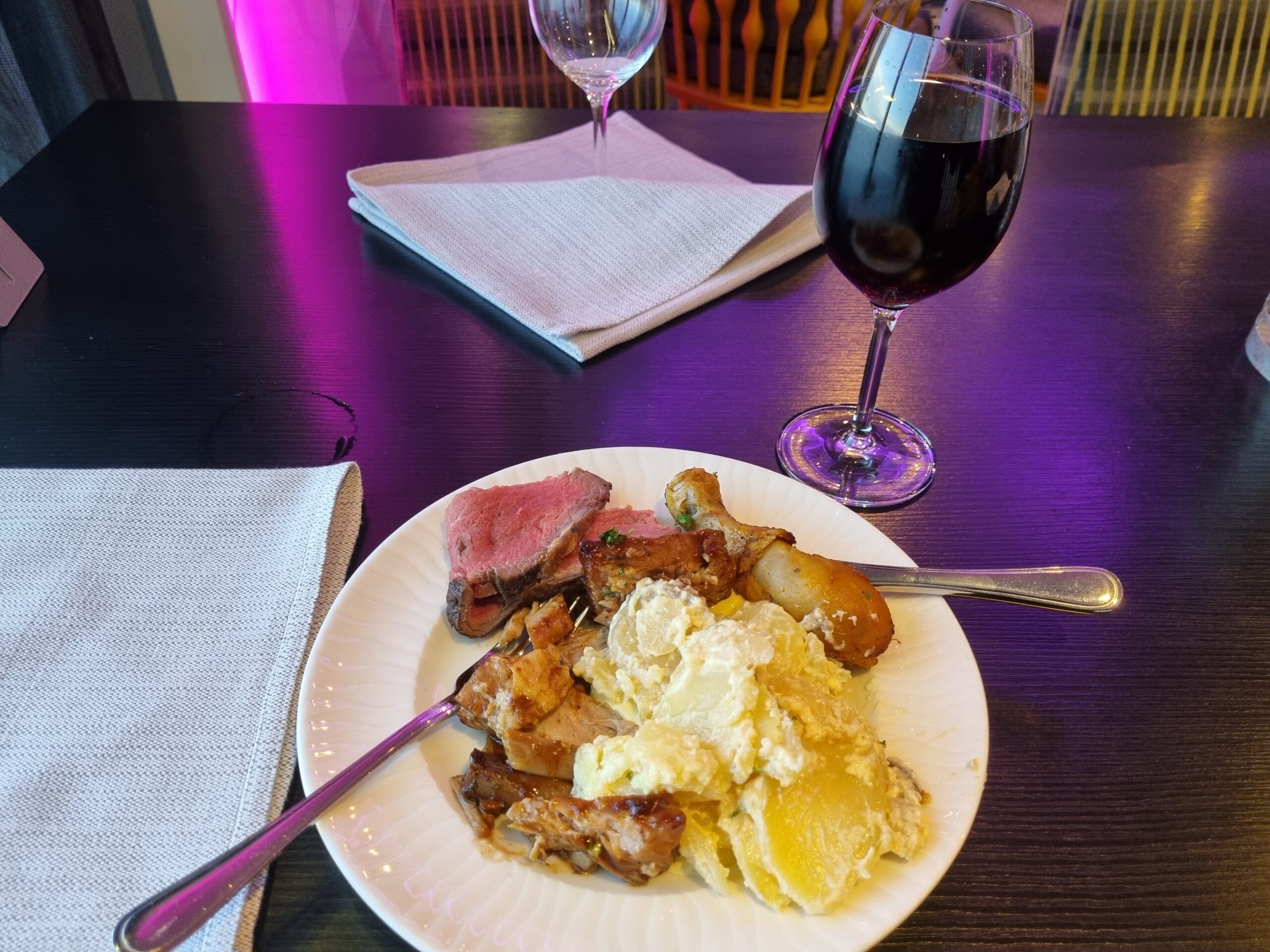 Åt stor buffet till både lunch och middag. Första kl 14 och andra klockan 21.55. På buffeten fanns kalla fiskrätter som gravad lax, strömming, olika sillar, romkorn, blinier, sallader, bröd, ostar, skaldjur. Även kallskuret kött och fågel. Viltpate exempelvis fanns också. Varmrätterna var bland annat helstekt nötkött på bit som kockarna skar upp och lade upp på tallriken man fick räcka fram. Viltskav, BBQ fläsksida, köttbullar och liknande erbjöds ocksä till självplock. Efterrätterna var många och goda. Åt 3 sorters glass/sorbet, olika topping på det samt en bit chokladtårta som var mycket god. Drack vatten och sockerfri colaläsk samt kaffe. Allt ingick i priset.