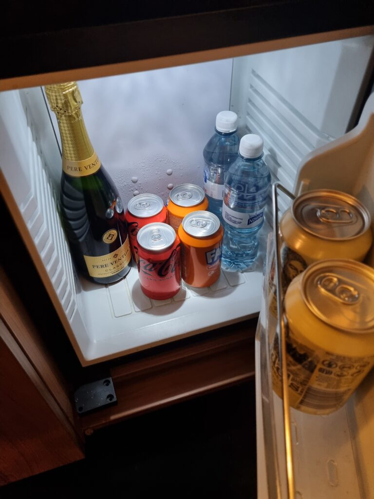 Inkluderade drycker i minibaren i sviten på en Finlandsfärja.