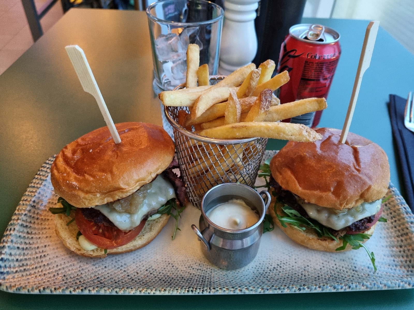 2 st läckra Hamburgare för 1 person serverade med pommes frites samt aioli till. Alltså ombord på ett kryssningsfartyg på väg ut på Ålands Hav.