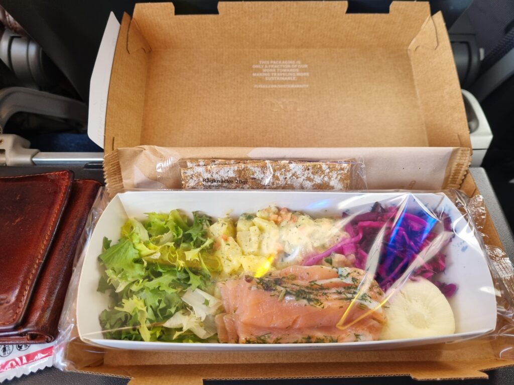 En god och smakrik måltid serverad ombord en A320 på väg hem från Paris med ett välkänt mycket stort Skandinaviskt flygbolag. kallrökt lax med potatissallad och en god smaksatt creme till. Samt picklad rödkål och salladsblad.