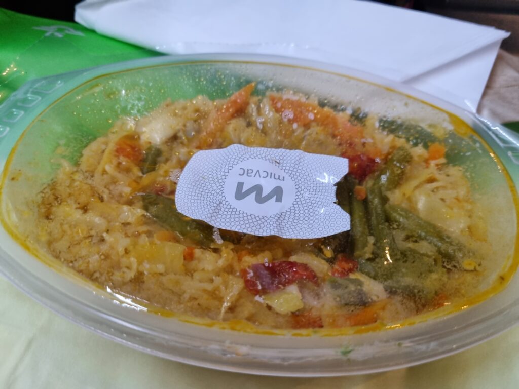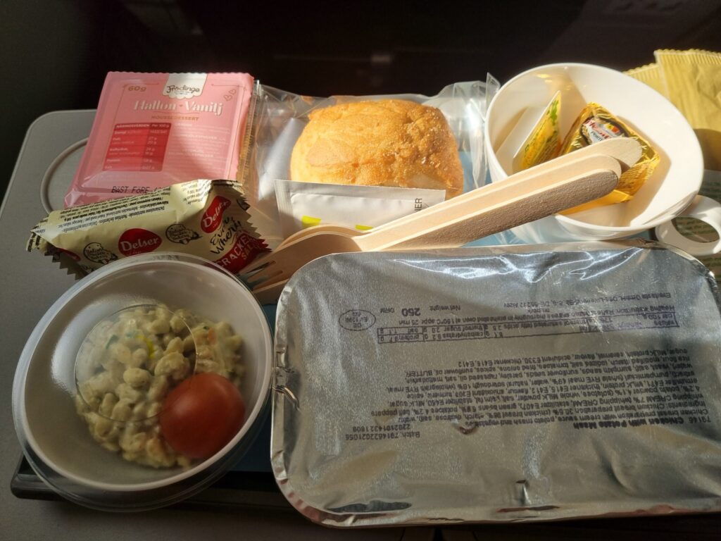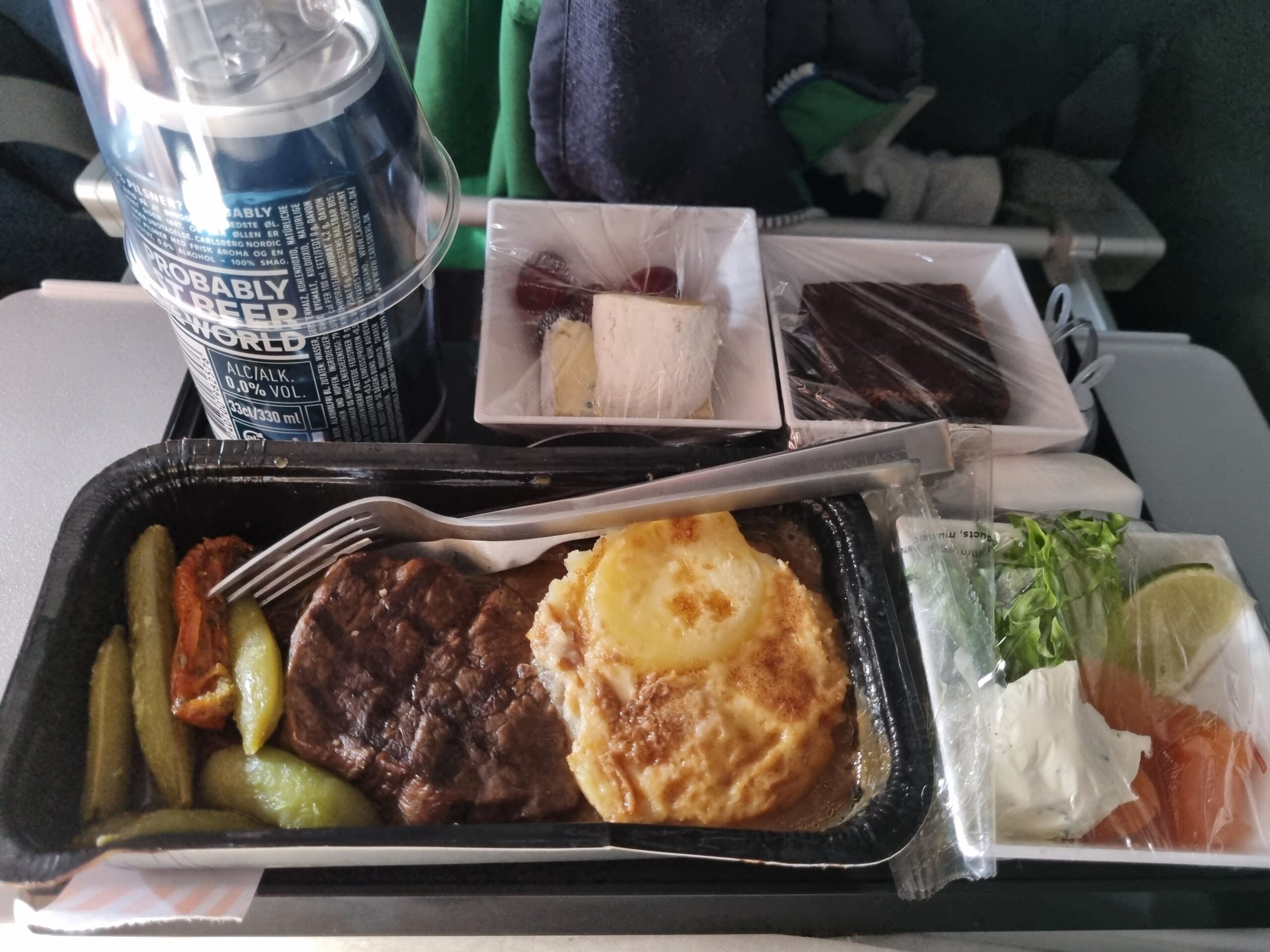 Oxfilén var god men lite för genomstekt för min smak. Potatisgratängen smakade helt ok. Förrätten var god men det kunde ha varit mera av den goda kallrökta laxen. Kakan var ok och ostarna var mycket goda. Varmt bröd och smör samt salta kex hörde också till maten. Och kaffe samt 1 glas vin, öl, läsk, juice eller vatten. På den tiden jag fotograferade denna bricka var det till och med metallbestick på matbrickan. Vet inte om det är det fortfarande. Och 1 litet set med salt och pepparströare finns med på ett hörn av brickan. Skålarna och faten till ost, förrätt och kaka är i hårdplast som vad jag förstår diskas av cateringfirman efter resan. Oxfilén serveras rykande varm i en enkel engångs papperslåda med genomskinlig plastfolie över.