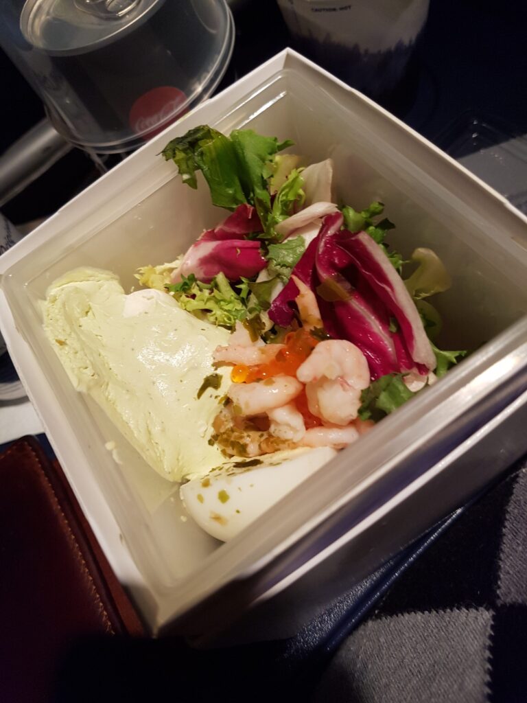 Bild 1: Skaldjurssallad med räkor, ägg och majonäs serverad ombord på SAS på ett flyg inom EU.