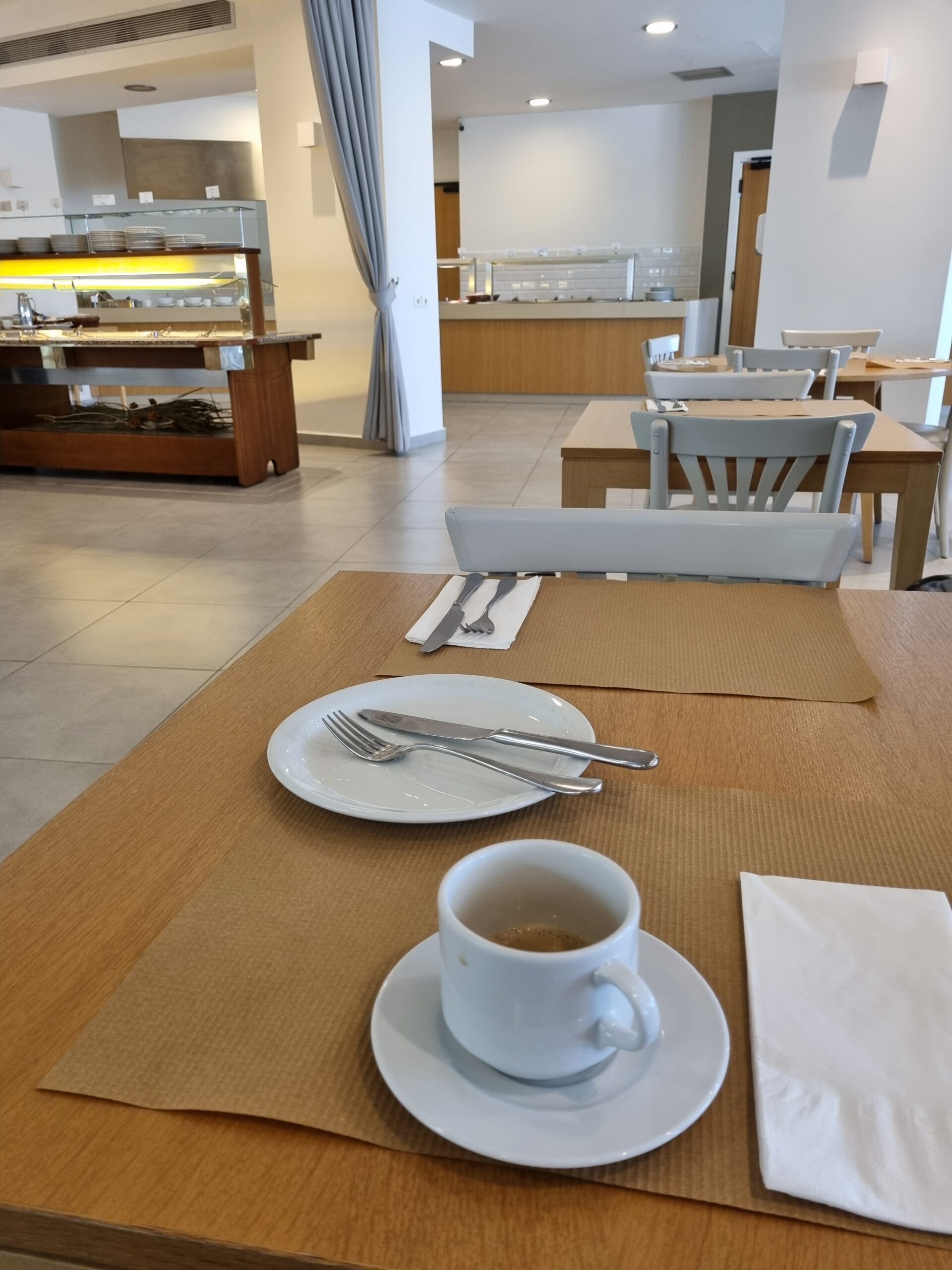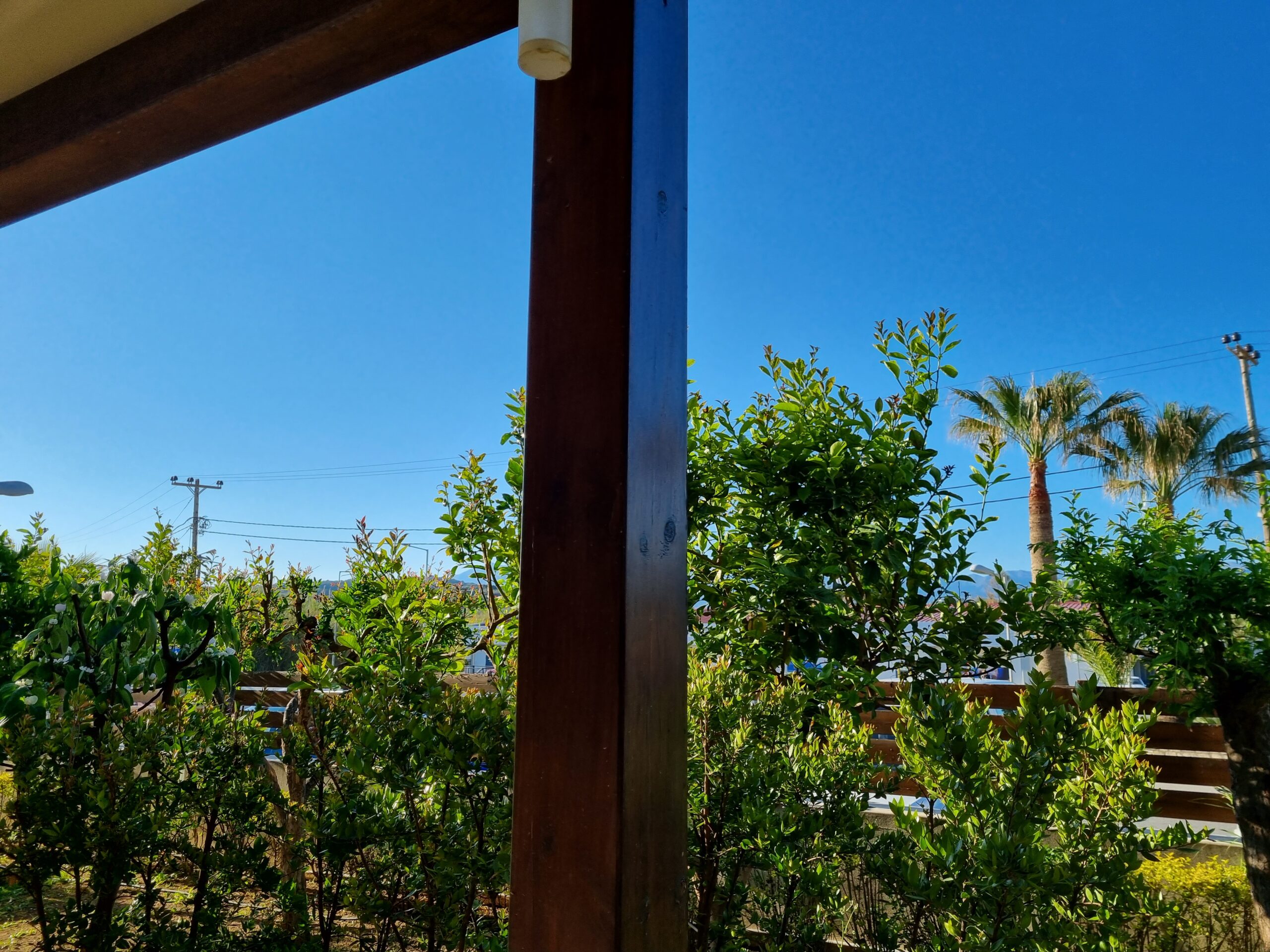 Fin utsikt mot bergen, apelsinträd och palmer vid frukost på uteserveringen